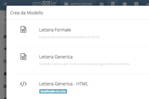 Gmoole Cloud CRM ti consente di automatizzare la creazione della modulistica standard da inviare al cliente. Puoi creare i modelli tramite Word in formato Docx inserendo una serie di variabili che il sistema sostituirà in fase di generazione (es. il nome del cliente).