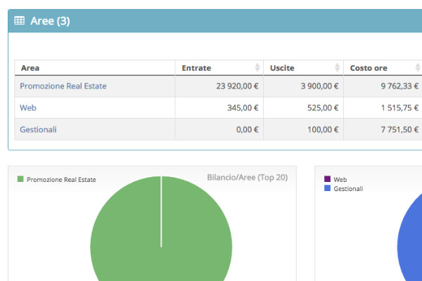 Il report di Business Intelligence consente un analisi dell'attività lavorativa multi livello: una volta selezionato il periodo temporale d'interesse è possibile analizzare i dati per area, cliente, progetto, tipologia di attività e risorsa. E' inoltre possibile: